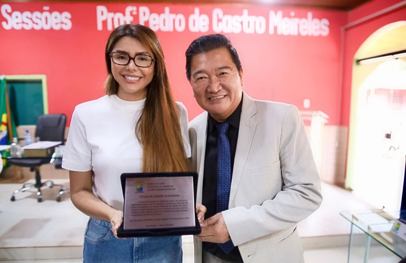 “Na manhã desta sexta-feira, em Plácido de Castro, vivi um momento especial ao receber uma Moção de Aplausos da Câmara Municipal. Essa homenagem representa, para mim, muito mais que um reconhecimento pessoal: é o reflexo do trabalho que temos realizado à frente do Iteracre, com dedicação e compromisso. Cada avanço na regularização fundiária é fruto da união de esforços e da confiança das famílias acreanas, que sonham e acreditam em um Acre desenvolvido economicamente e socialmente, uma terra de proprietários, um solo seguro para os acreanos”, escreveu ela, nas redes socais.